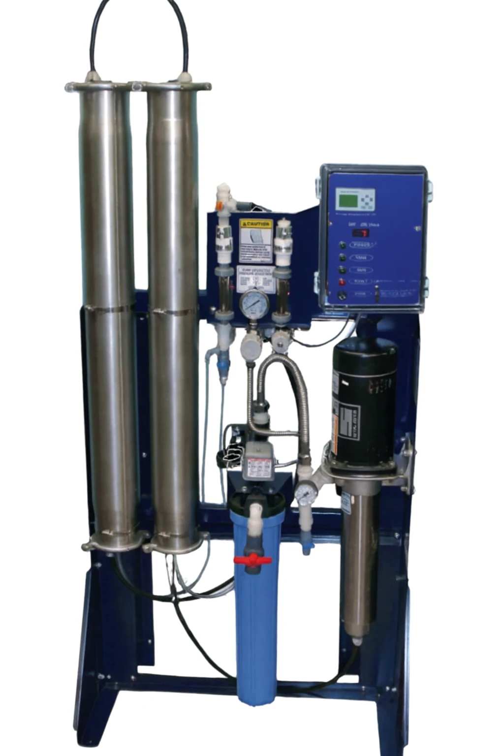 The CWM system utilizes 4 inch by 40 inch extra low energy thin film RO membranes to efficiently reduce a broad range of contaminants while operating at a steady 50 percent recovery rate. Available in configurations producing 1,500 to 3,000 gallons per day, the CWM supports a wide range of commercial needs including food service, laboratories, light manufacturing, and retail operations. A 3/4 horsepower centrifugal pump with a 304 stainless steel shell and 316 stainless steel shaft provides reliable pressure and consistent flow, while stainless steel pressure vessels and a rugged 409 stainless steel frame ensure long-term performance.